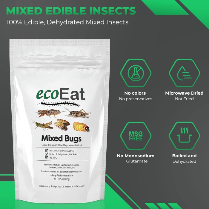 We at ecoEat provide dehydrated mixed bugs which are carefully packed with no preservatives.