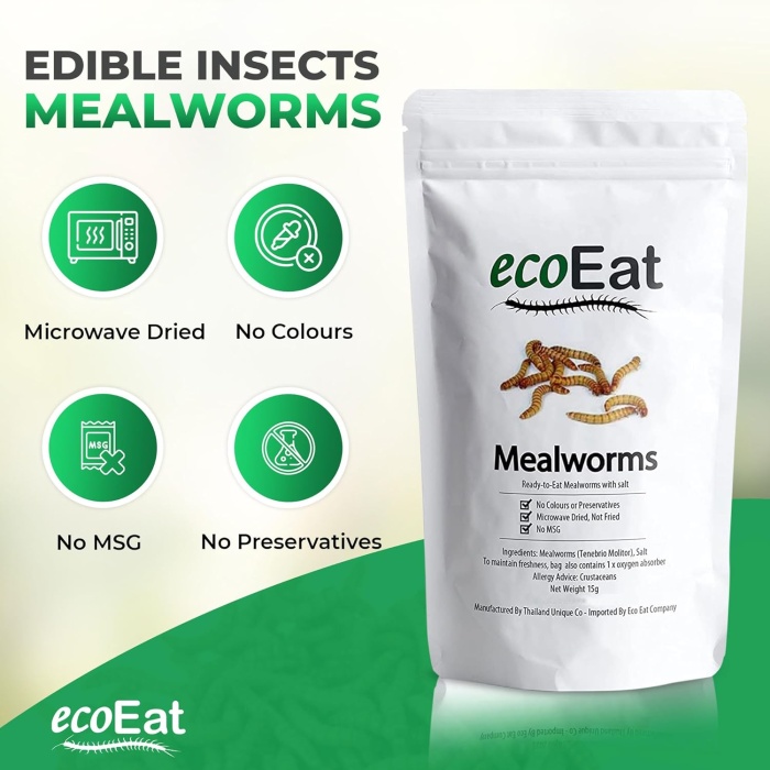 Dehydrated Salted Mealworms (Tenebrio Molitor). Can be used as a crunchy topping for savoury or sweet dishes or enjoy them on their own as a high protein snack.
