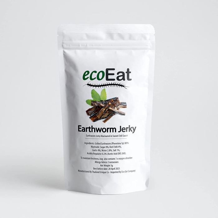 Earthworm Jerky is made from farmed pheretima species earthworms that are grown in Northeast Thailand at the tail end of the monsoon season. They are used in Chinese medicine but can also be eaten as a nutritious high protein food. Our earthworms are thoroughly cleaned and dried, and then marinated in a sweet chili sauce and dry roasted.